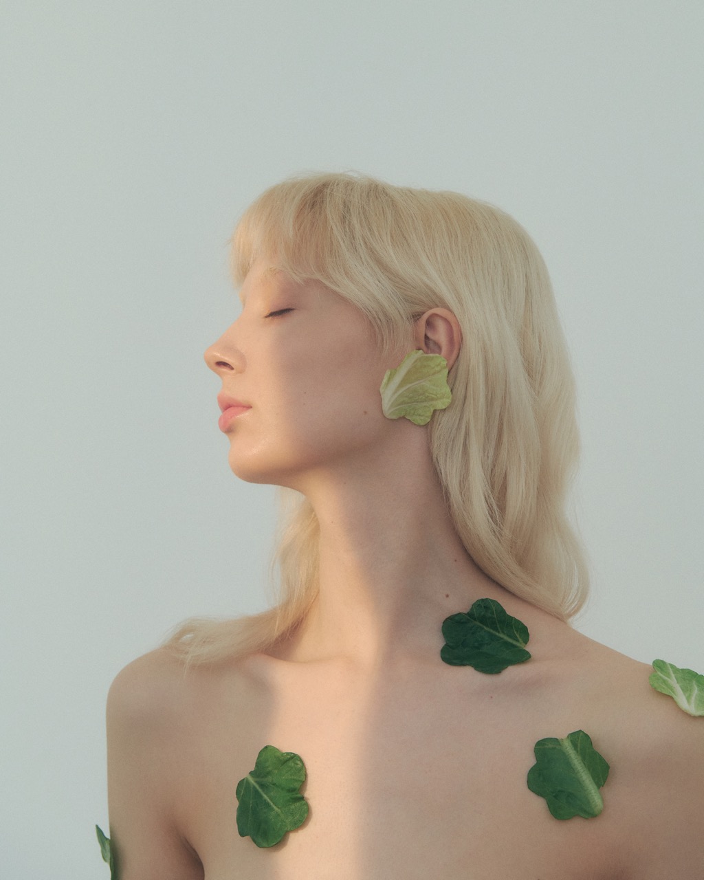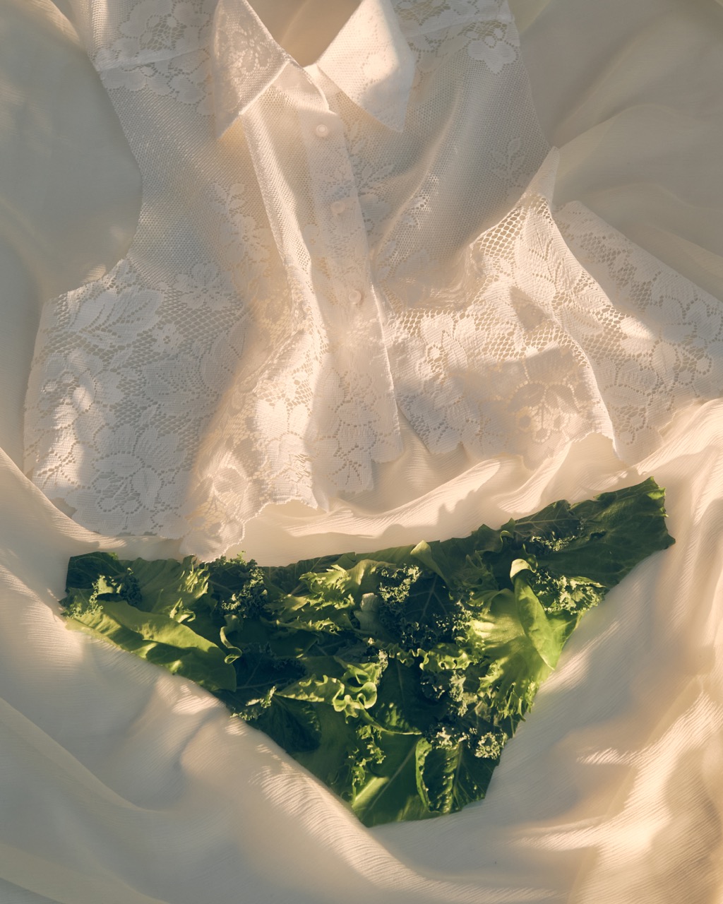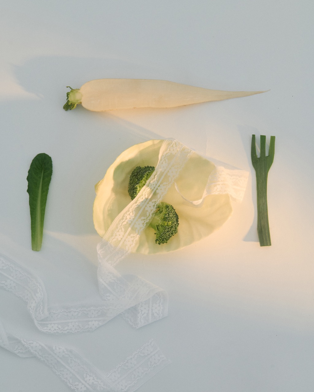 Идея этой творческой фотосъемки - сделать историю про зарождение героев из природы. Для съемки я вырезала из разных капустных листьев фигуры, миксовала кружево и овощи